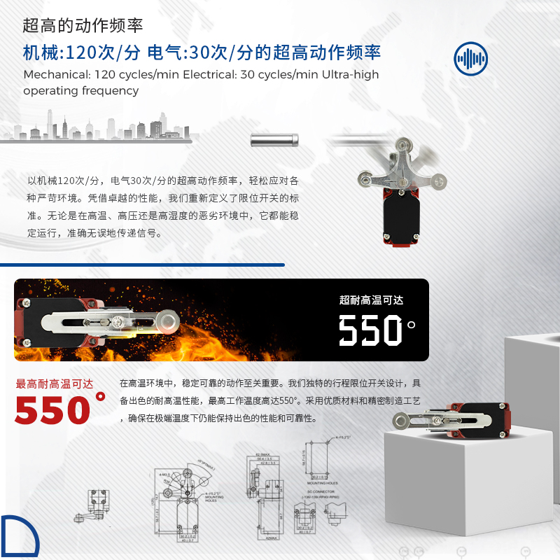 凱基特耐高溫行程開關具有以下優點:超位報警,安全可靠,接觸檢測,磨損小。耐高溫最高可達550℃。鋁合金外殼 高機械強度,防護等級IP67 耐油、防水和防壓結構。