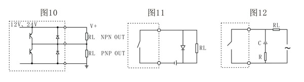 接點工作有兩種方式:直流方式和交流方式。在兩種方式下對負荷的性質未能加限制,可接入阻性負荷或感性負荷,但是這兩種方式下使用上略有不同,如圖11所示,是直流方式的接線法,圖12是交流方式的接線法。